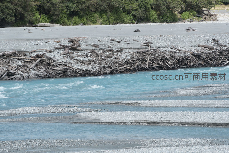一条碧蓝的河流在宽阔的石滩上蜿蜒流淌,岸边堆积着大量被冲刷上岸的枯木枝干,形成天然的屏障,展现了河流与陆地的动态边界。