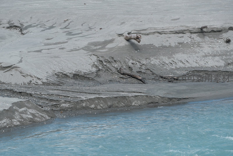 冰川融水冲刷河岸,灰泥与蓝水交织