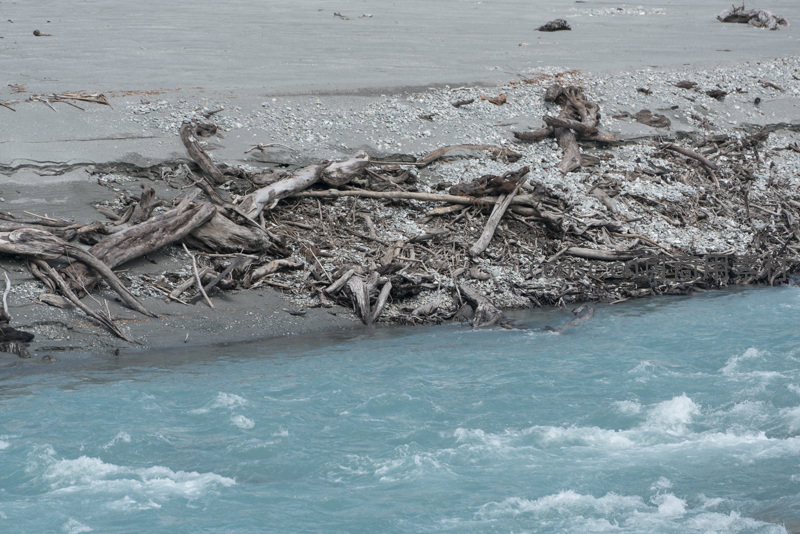 大量被水流冲刷上岸的枯枝败木堆积在河滩边缘,与细碎石砾混杂,清澈的河水温柔拍打,诉说着自然循环与时间痕迹。