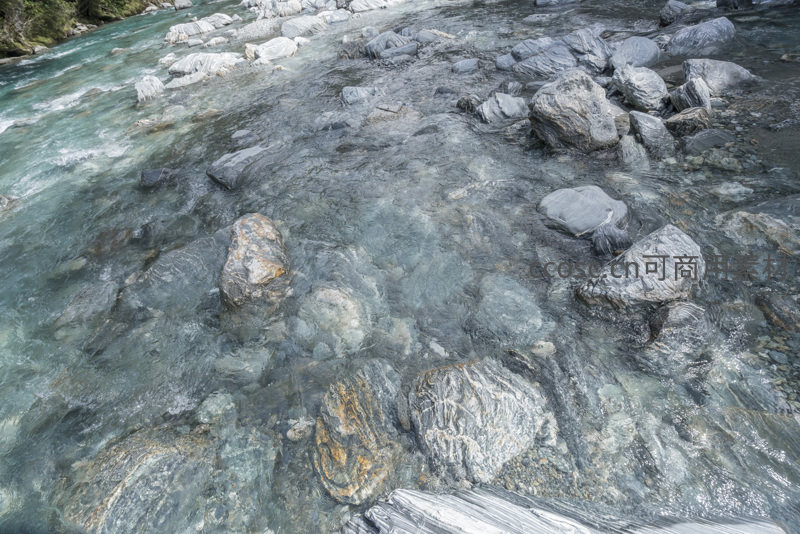 阳光穿透清澈河水,映照出河床中形态各异、色彩斑斓的圆润石块,水流轻柔滑过,营造静谧自然氛围。