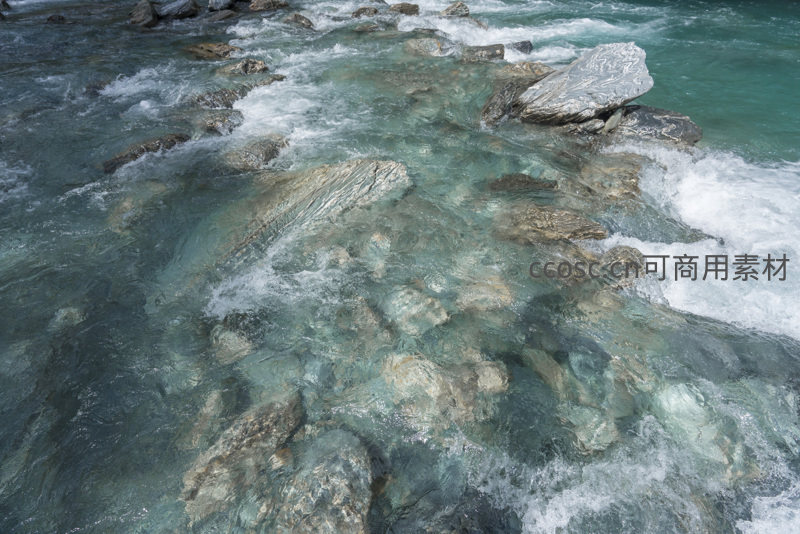 碧绿清澈的溪水在阳光下奔腾,冲刷着形态各异的河床岩石,激起层层白色浪花,展现大自然原始而宁静的力量。
