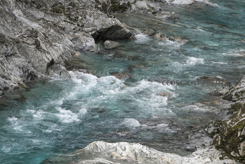 清澈碧绿的溪水在嶙峋的灰白岩石间奔腾流淌,激起层层白色浪花,展现出原始山野中水流的磅礴力量与自然之美。