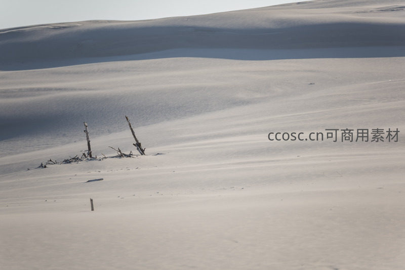 连绵起伏的雪丘表面光滑如绸,两根断裂的枯木斜插其中,构成简洁有力的视觉焦点,凸显了自然环境的广袤与生命的坚韧。