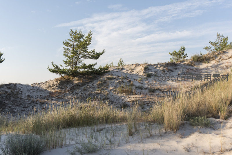在广阔的沙丘之上,一棵孤松顽强生长,背景是清澈的蓝天和飘逸的云朵,展现出大自然的宁静与壮美。