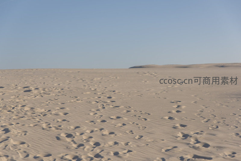 一片广袤无垠的沙海,细密的沙粒上留下零星足迹,远处沙丘起伏,天空湛蓝,尽显荒凉与辽阔之美。