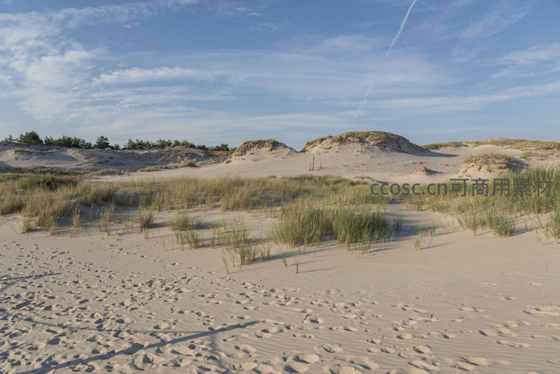 阳光洒在起伏的沙丘上,绿草点缀其间,远处松林与蓝天相接,营造出一片宁静而原始的自然景观。