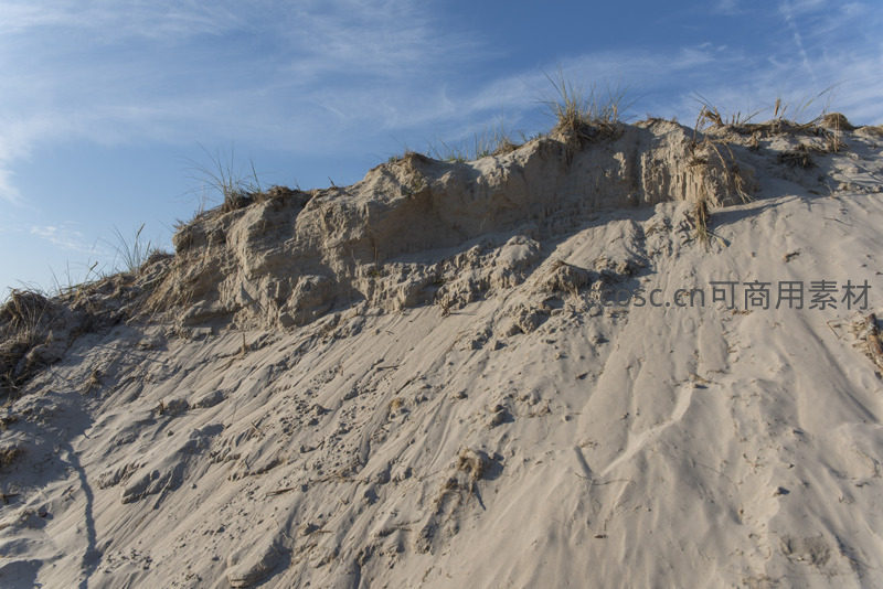 细腻的沙粒被风吹出流畅的纹路,沙丘斜坡上裸露的土层和稀疏草根,记录着自然力量塑造地貌的过程。