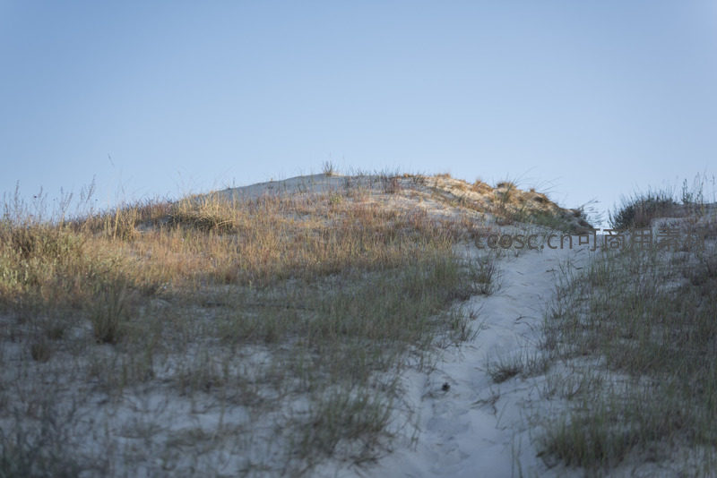 一条被踩踏出的小径蜿蜒穿过覆盖着稀疏草丛的沙丘,引向远方的坡顶,仿佛邀请旅人踏上探索这片寂静沙海的旅程。