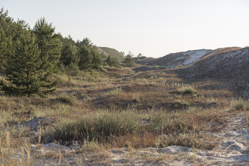 松树沿沙丘边缘排列,金色夕照洒落其上,干草与沙土交织,勾勒出一幅宁静而富有层次的自然画卷。