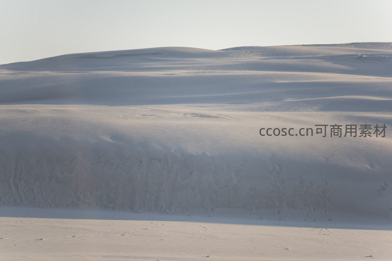 在寒冷的冬日,强劲的风力塑造了这片雪原上独特的风蚀地貌,层层叠叠的雪浪与裸露的沙土形成强烈对比,展现出大自然鬼斧神工的力量。