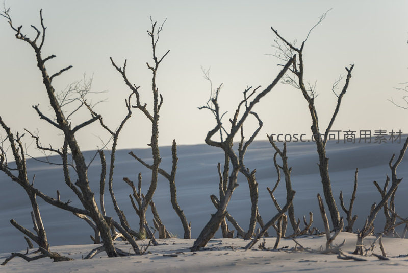 在广袤无垠的雪原上,一簇枯死的树枝倔强地挺立着,它们扭曲的枝干在柔和的光线下投下斑驳的影子,构成了一幅充满诗意与苍凉感的自然画卷。