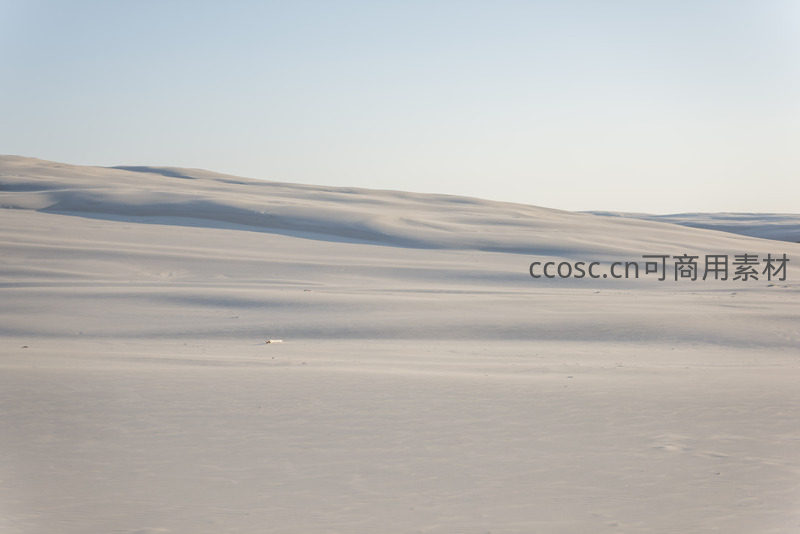 在清澈湛蓝的天空下,洁白的沙丘如波浪般层层叠叠,柔和的线条向远方无限延伸,展现出大自然鬼斧神工的宏伟与纯净。