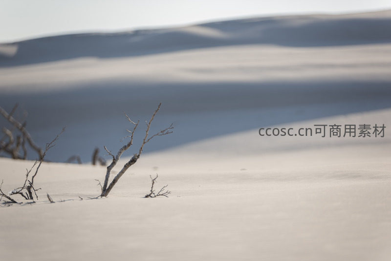 孤枝立于白沙之上,背景沙丘朦胧如画
