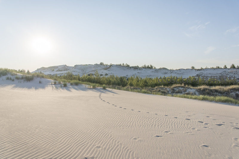 清晨的阳光温柔地照亮沙丘,一串脚印延伸向远方绿植覆盖的沙丘,象征着探索与自由的旅程。