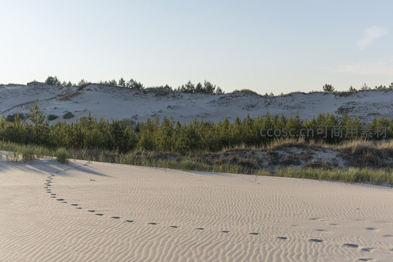 细软沙丘上留下一串清晰足迹,远处松林点缀,晨光柔和,营造出人迹罕至、静谧悠远的自然氛围。