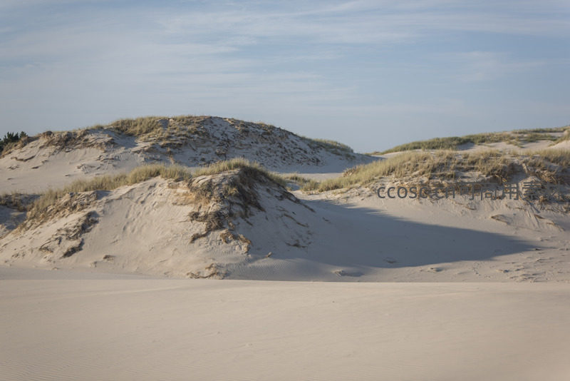 连绵起伏的沙丘覆盖稀疏植被,在晴朗蓝天下延伸至远方,展现辽阔而宁静的自然地貌与天地和谐之境。