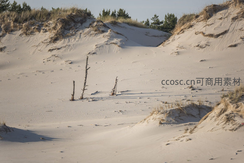 几根干枯的树桩孤独地矗立在细腻如雪的沙丘上,阳光拉长它们的影子,在无垠的白色沙海中勾勒出沧桑的线条,营造出一种静谧而略带悲凉的美感。