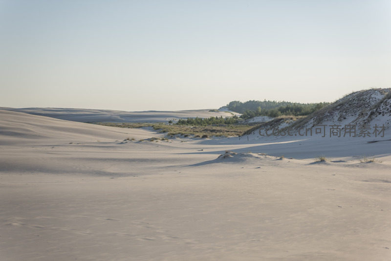 无边无际的沙原向远方延伸,沙丘起伏如波浪。在视野尽头,一片深绿色的森林若隐若现,为单调的沙色增添生机,让人感受到大自然的辽阔与神秘。