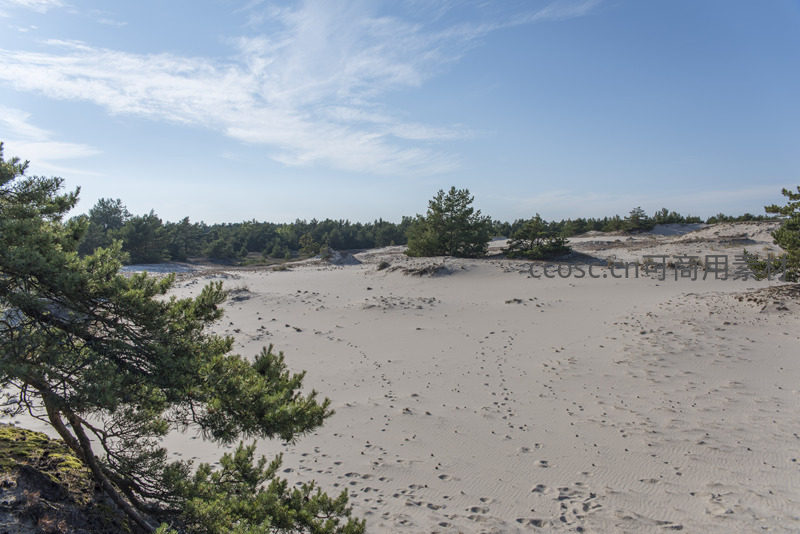 湛蓝天空下,无垠的沙地上散落着零星足迹和几株坚韧的松树,营造出一种辽阔、原始且充满生命力的自然氛围。