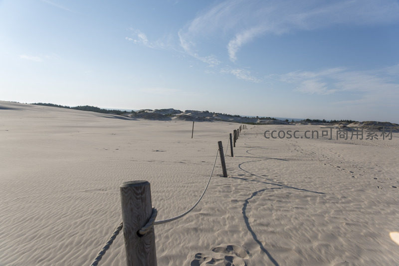木质围栏与绳索在沙地上划出清晰路径,脚印点缀其间,引领视线穿越广袤沙丘,直抵天际。