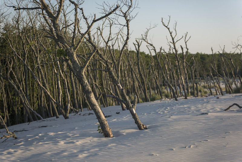 几株枯树倾斜于洁白沙丘之上,背后是茂密林带,晨光为场景镀上温暖色调,充满诗意与苍凉感。