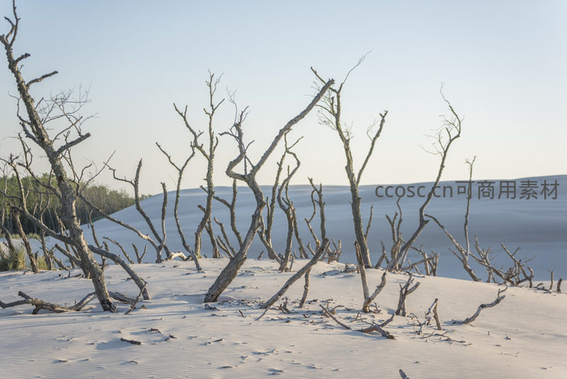 干枯树枝散落于雪白沙丘之上,远处沙丘轮廓柔和,天空澄澈,构成一幅静谧而略带孤寂的自然画卷。