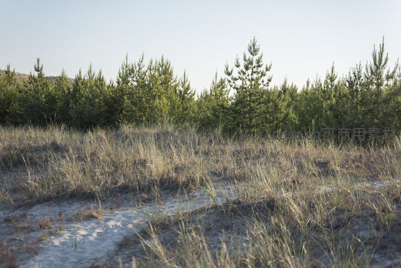 松林边缘的沙地草丛静谧如画