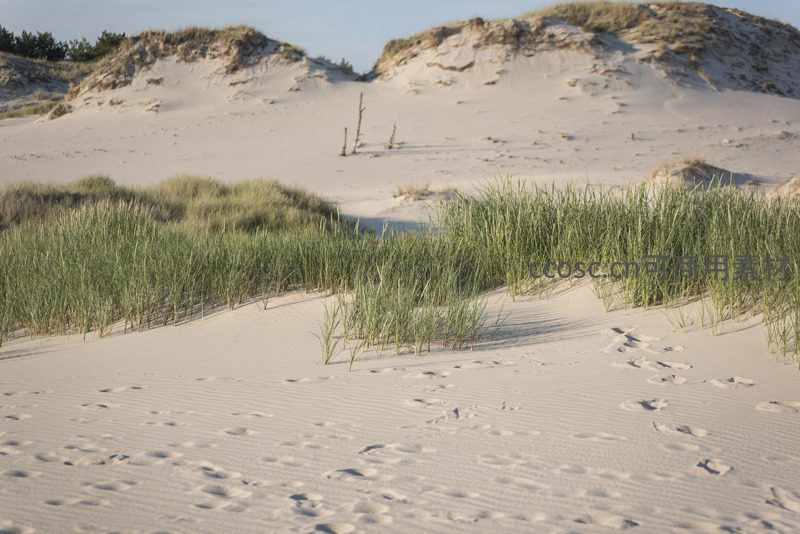 细腻的沙面上留下零星足迹,翠绿的草丛沿着沙丘蔓延,构成一幅充满生活气息又不失自然野趣的海滨画面。