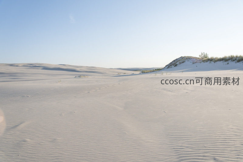 广阔无垠的白色沙丘在阳光照射下呈现出细腻的波纹纹理,远处低矮沙丘与蓝天相接,尽显大自然的纯净与辽阔。