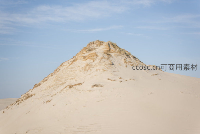 一座高耸的沙丘在晴朗天空下傲然挺立,顶部点缀着顽强生长的草丛,展现出生命与荒芜共存的独特生态景象。
