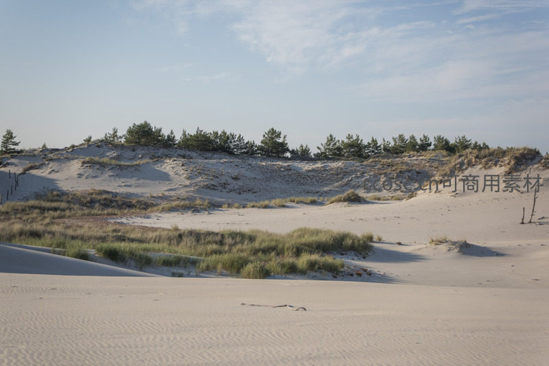 广阔的沙丘起伏连绵,顶部点缀着坚韧的绿树,与清澈的蓝天相映成趣,营造出宁静而壮美的自然景观。
