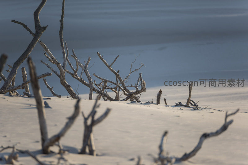 雪白的沙地上散落着干枯的树枝,在柔和的光线下显得格外孤寂,营造出一种苍凉而宁静的冬日氛围。
