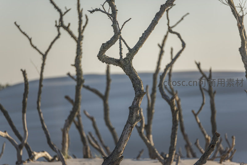 扭曲的枯枝在明亮沙丘背景下形成强烈剪影,展现生命凋零与自然力量的碰撞,充满苍凉而坚韧的意境。