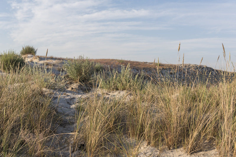 沙丘间的小径被茂盛野草半掩,远处沙丘起伏,天空云卷云舒,呈现出未经雕琢的原始野趣与自然生态之美。