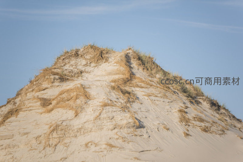 仰拍视角捕捉沙丘顶端被风雕刻的层叠纹理,枯草点缀其间,蓝天为幕,凸显地质变迁的自然力量。