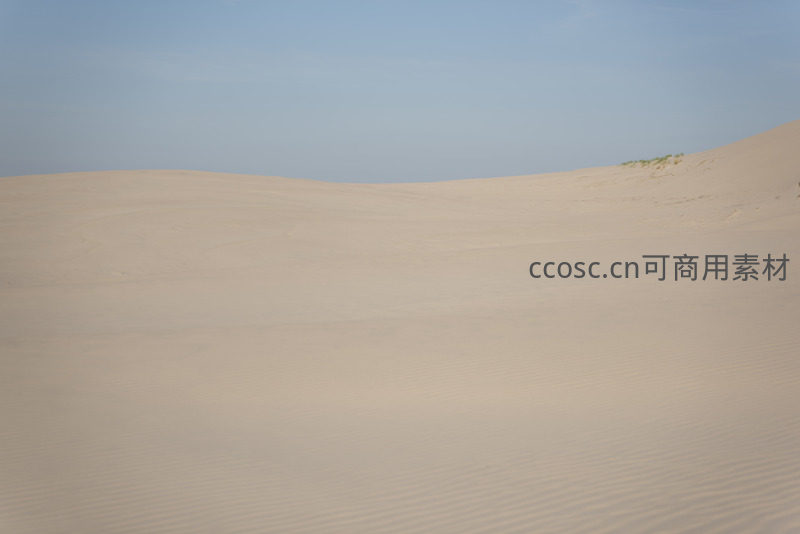 一望无际的沙丘在淡蓝天空下延展,细密风纹覆盖表面,偶有绿植点缀,传递出苍茫辽阔的自然气息。