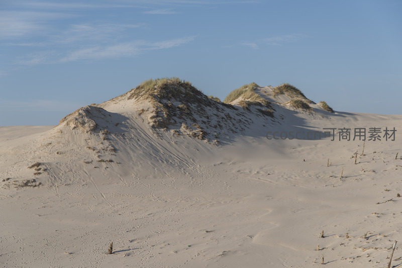 阳光斜照在覆有稀疏草丛的沙丘上,光影交错间凸显沙粒质感与植被生命力,呈现风沙地貌中顽强生长的自然景象。