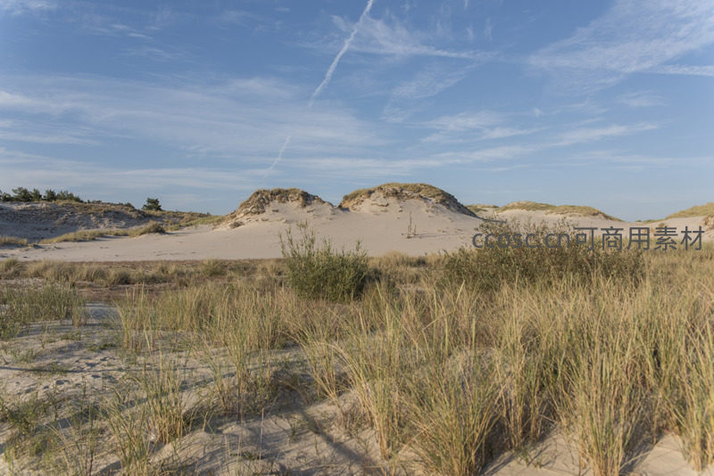 蔚蓝天空飘着轻盈云絮,连绵沙丘与枯黄野草相映成趣,画面开阔宁静,传递出远离尘嚣、回归自然的悠然意境。