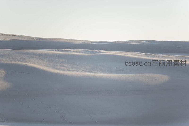 在清晨柔和光线的映照下,雪白的沙丘如凝固的波浪般起伏,表面光滑纯净,营造出一种空旷而静谧的氛围,极具视觉冲击力。