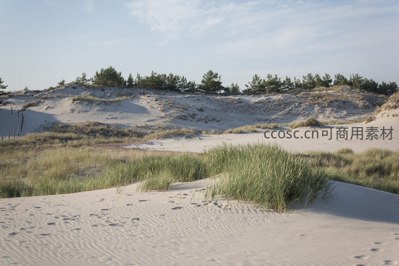 阳光洒在起伏的沙丘上,绿草点缀其间,远处松林与蓝天相接,构成一幅宁静而壮美的自然画卷。