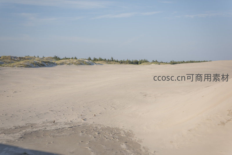 广袤无垠的沙丘在远处与绿植相接,稀疏草丛顽强生长于沙土之间,营造出荒芜中孕育生机的独特美感。