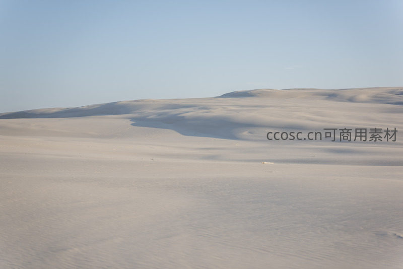 无垠的白色沙丘在晴朗天空下舒展,柔和的光影勾勒出流畅的曲线,营造出空旷而静谧的自然意境。