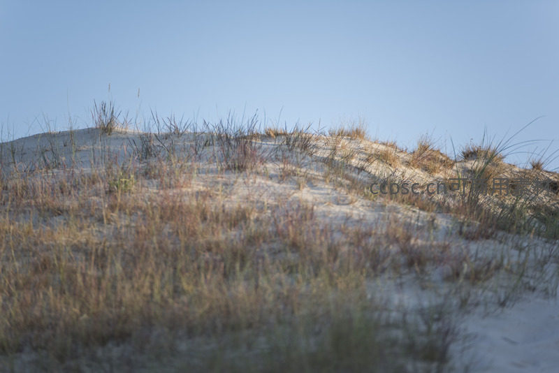 沙丘顶端稀疏的野草在微风中轻轻摇曳,细密的沙粒与坚韧的植物共同构成一幅充满生命力的自然微景。