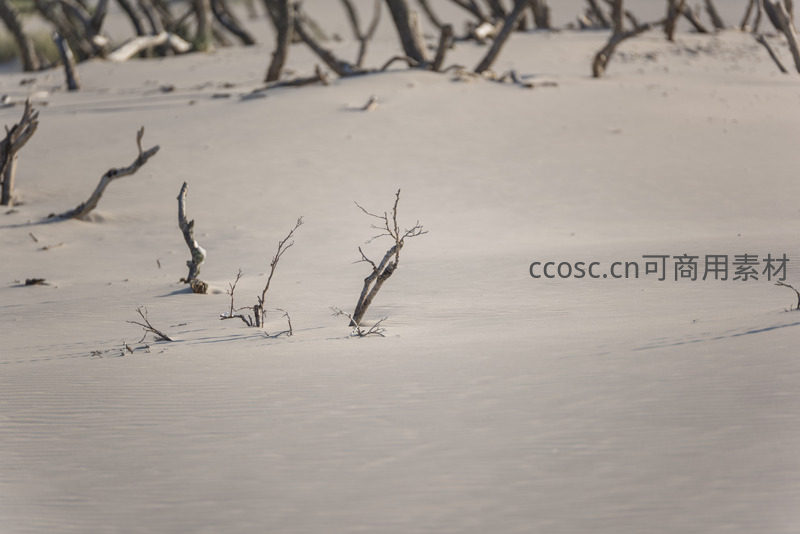 被风沙侵蚀的枯枝散落在细腻的沙地上,形成独特的线条与纹理,无声诉说着大自然的沧桑与生命的坚韧。