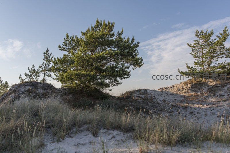 在晴朗的蓝天下,几棵坚韧的松树扎根于起伏的沙丘之上,周围是随风摇曳的草丛,展现出大自然的宁静与生命力。