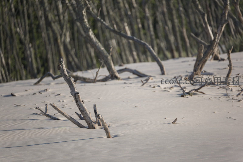 几根灰白的枯枝从洁白的沙地中探出,在柔和光线下投下细长阴影,勾勒出一种荒芜却充满诗意的孤寂美感。