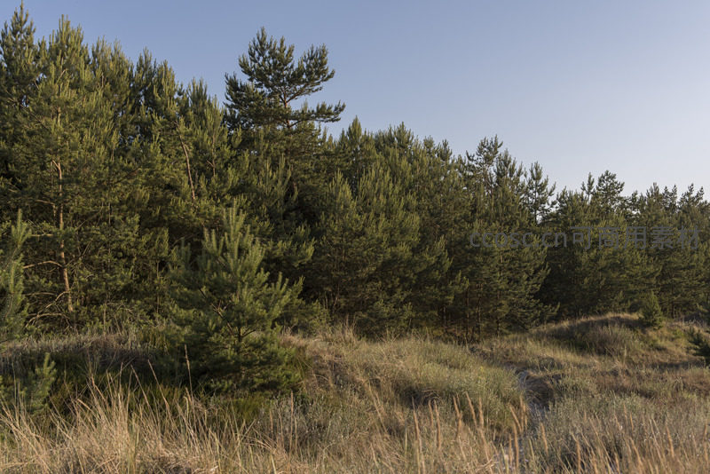 茂密的松林与起伏的沙丘相接,绿意盎然与金黄沙土形成鲜明对比,展现了自然生态中不同地貌和谐共存的静谧之美。