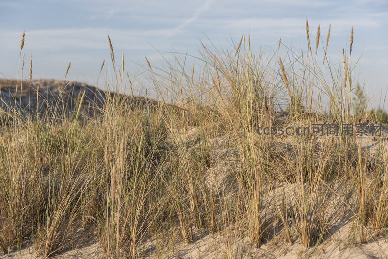 沙丘之上,高高的草丛在微风中轻轻摇曳,金黄色的穗子与淡蓝天空相映成趣,构成一幅充满野性与动感的自然风景画。