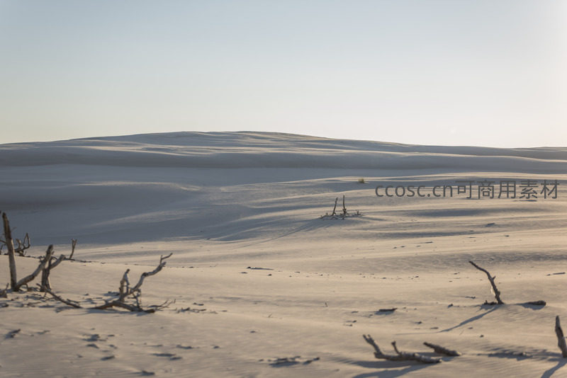 广袤无垠的雪原覆盖大地,几株枯木零星散落,投下细长的影子,在纯净的白色世界中诉说着冬日的孤寂与苍凉。