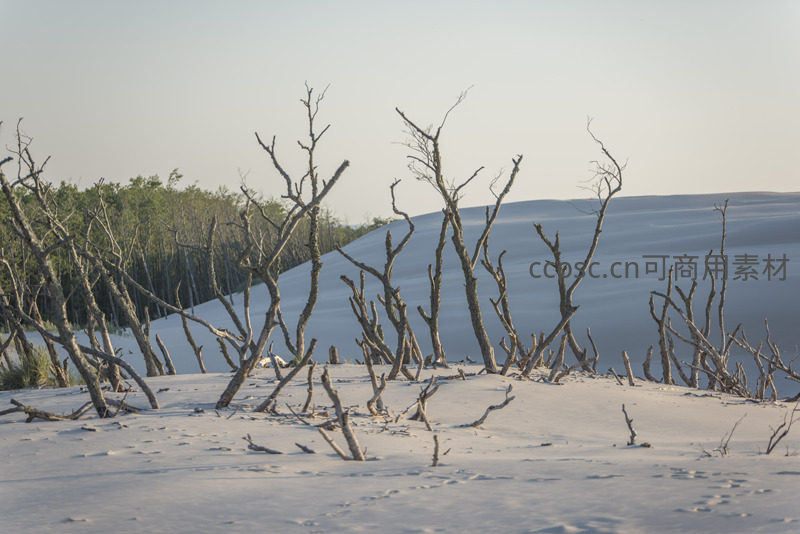 洁白的雪坡前,一群形态各异的枯树挺立,枝条在柔和的光线下勾勒出优美的剪影,营造出一种冷冽而诗意的冬日意境。